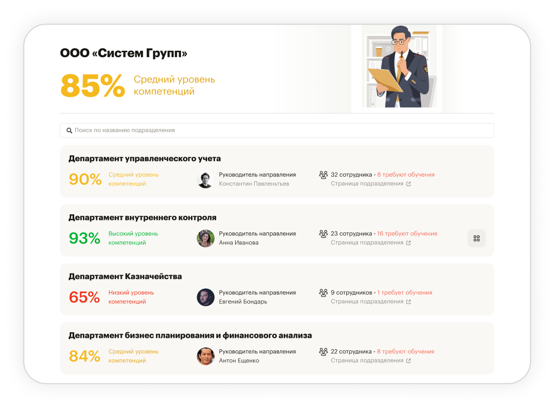 - Увидите зоны роста компетенций сотрудников финслужбы по направлениям